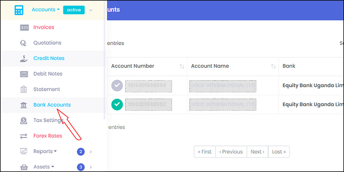 From your administrative dashboard, on the left main menu navigate to Bank Accounts under Accounts as shown in the below screenshot