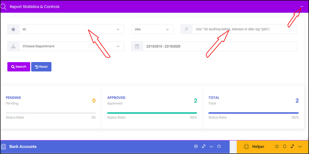 To search for a bank account, expand Report Statistics & Controls Tab by clicking the plus sign on the tab. You then have to select the criteria you would like to use to search for such as account number, account name, account type among others by choosing it from the drop down where the left arrow is pointing. Enter the search query in the space where the right arrow is pointing and click on the search button.