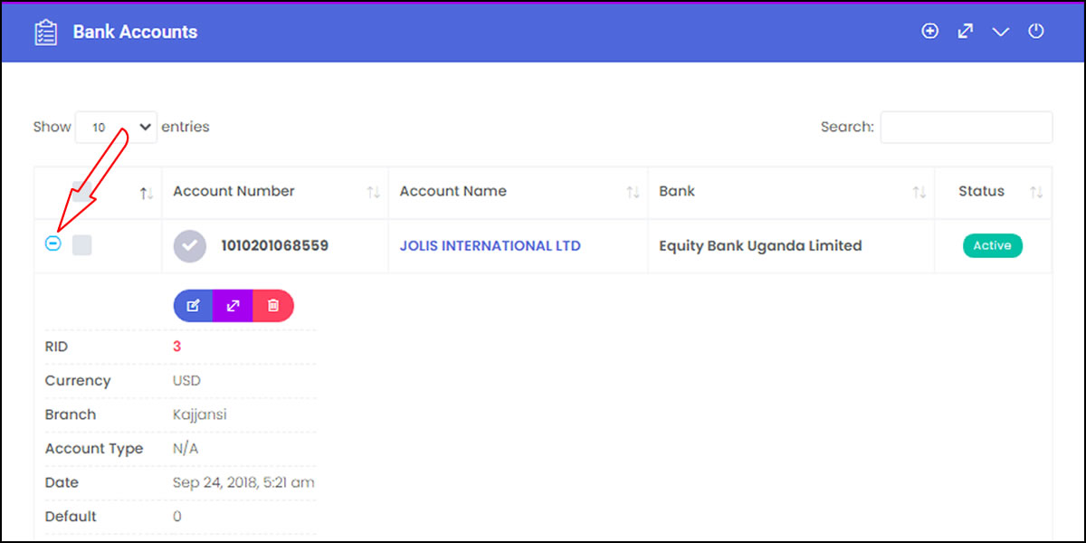 You can be able to view more details about bank accounts by clicking on the plus button next to the bank account whose details you are interested in. This will help you know the currency of the bank account, bank branch, account type, date among other details.
